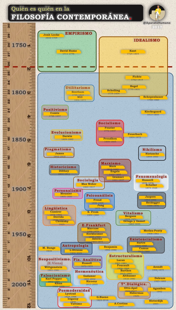 En esta infografía vas a encontrar muchos de los principales fiósofos de la edad contemporánea. Podrás observar visualmente a qué corriente pertenecen o sus lazos de unión con los filósofos anteriores y posteriores.
